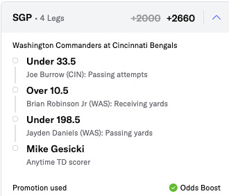 The Bengals' defensive line, particularly on the interior, is very banged up and feeling the offseason loss of DJ Reader. If the run game can get going for Washington, Daniels won’t need to be called on as often to make key plays.