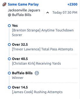 Something I touched on a little bit after Week 1 when betting on the Bills vs the Dolphins is the style of defense the Bills are playing right now. Defensively Buffalo is playing what can be commonly known as “bend-don’t-break”. The Bills are taking away the big plays, executing a lot less press-man coverage between the ’20s, and in doing so are giving up a lot of underneath passing yardage. By doing this you make the opposition methodically and patiently march down the field, and while that may not be great for # of plays run, it is great when projecting pass-attempts over. The principle part of this parlay is that the Jags are playing from behind, and will see an uptick in an already pass-happy offense. If that comes to be, the Bills will be content to let Lawrence attempt short passes underneath that will naturally juice up his attempt totals.